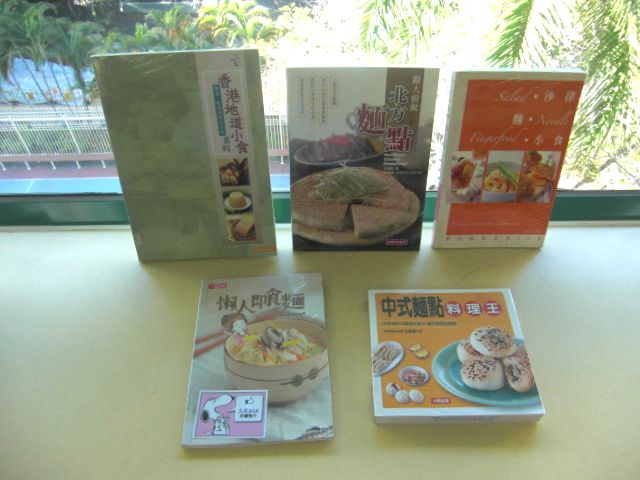包括《跟大廚做北方麵點》(427.11 4041),《中式麵點料理王》(427.11 8980),《香港地道小食:麵食,糕點及特色小吃系列》(427.16 5404),《600款麵飯聖經》(427.3 4402),《自家製美味意粉》(427.38 4458)、《懶人即食麵》(427.38 4458)、《出前一丁cook起》(427.38 4757)等等。